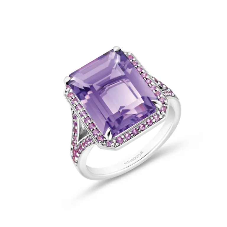 La bague Como 1953 attire tous les regards avec son beau volume, son style architectural et l'éclat de son améthyste, réhaussée d'un élégant pavage de saphirs roses. Caractère et sophistication sont les atouts majeurs de cette superbe bague!